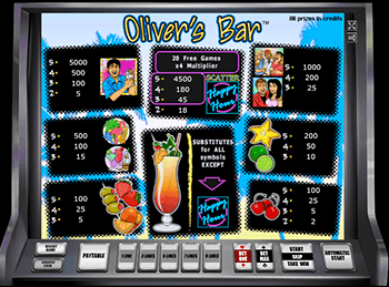 Oliver’s Bar – это игровой автомат от компании Novomatic. Вышеуказанный аппарат признан одной из лучших азартных игр в сети интернет. Демо-слот Бар Оливера признан одной из лучших азартных игр в сети интернет благодаря простоте сбора призовых комбинаций, широкому диапазону ставок и наличию красочных символов. На игровых полях любимой слот-машины геймерам попадаются сладкие вишенки, сочные апельсины, зеленые лимоны, сладкие клубнички, тропические коктейли (wild), а также таблички с надписями ”happy hour” (символы разброса).